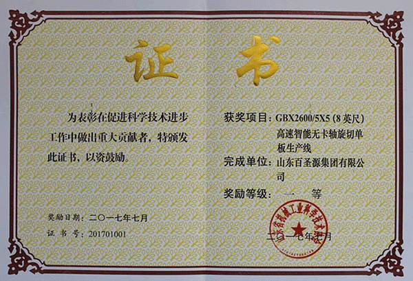 9月23日,在山东省机械行业新旧动能转换推进大会上,我公司生产的GBX2600/5×5(8英尺)高速智能无卡轴旋切单板生产线,荣获山东省机械工业科技进步一等奖。